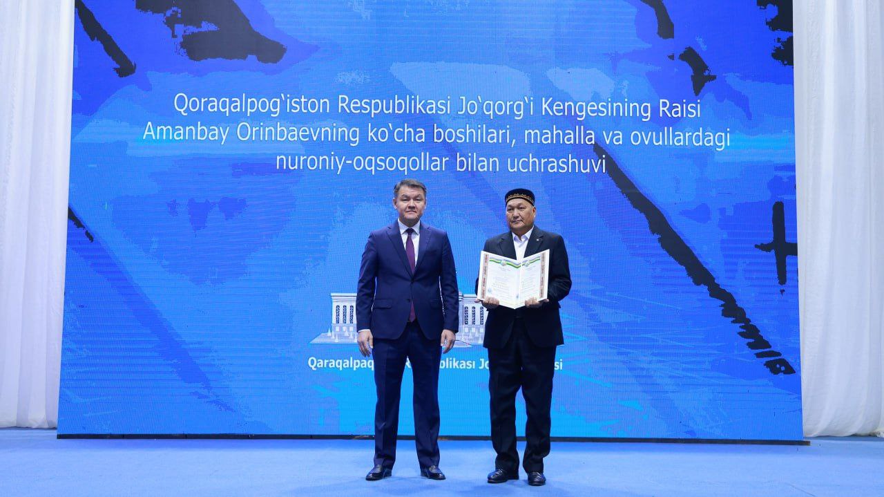 В завершение встречи, согласно решению Президиума Жокаргы Кенеса Республики Каракалпакстан, старейшины махаллей, отличившиеся многолетним трудом, жизненной мудростью и активной деятельностью по укреплению единства в обществе и воспитанию молодежи в духе преданности Родине, были награждены почетными грамотами Жокаргы Кенеса.